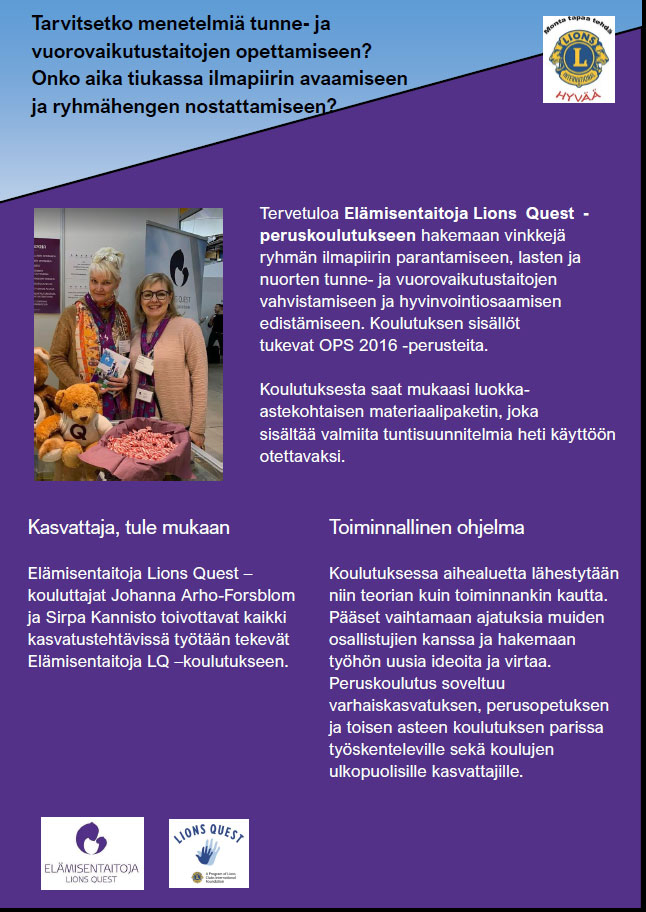 - Lions Quest –ohjelmat toimivat opettajan apuna ja tukena