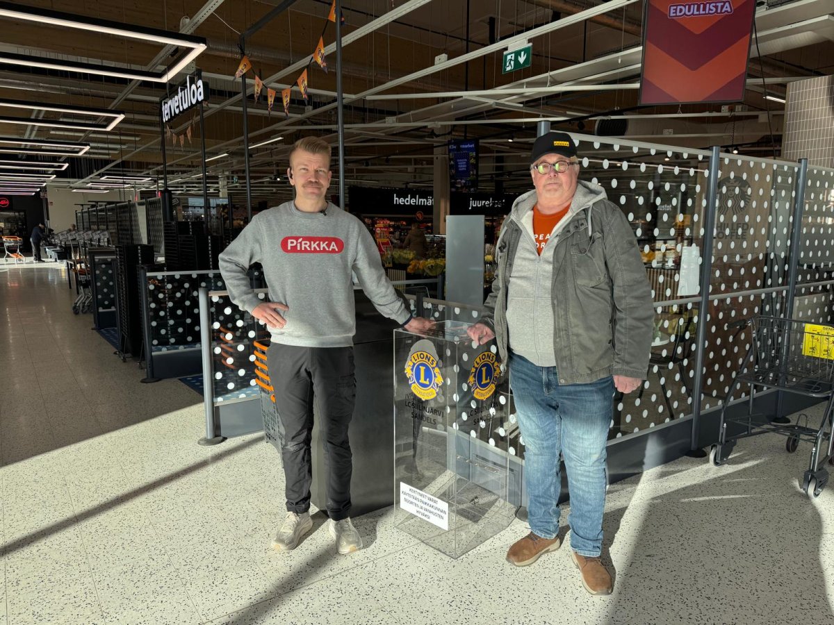 Leijonien keräyslaatikko on nyt uudessa K-supermarket Siilinhelmessä. Keräyksen tuotto menee nuorille ja vanhuksille. Keräyslaatikkoa asemoimassa kauppias Mika Parviainen ja klubi presidentti Kari Hiltunen.