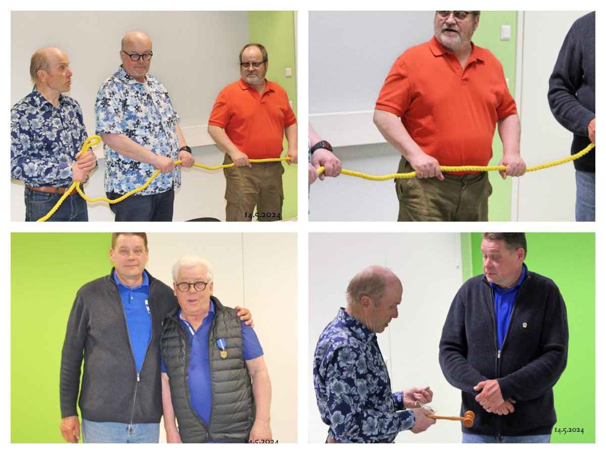 Toukokuun tapaamisessa oli vilskettä ja palkitsemista. Vierailevana esitelmöijänä jääkiekkovalmentaja Niko Eronen. Hän on ollut monessa eurooppalaisessa maassa jääkiekkovalmentajana. Esimerkkinä Tanska , Norja Unkari ja Slovenia. Niko kertoi erilaisista tavoista miten valmentajan palkka maksetaan. Kauden päätteeksi presidentti palkitsi kauden tehohenkilöitä. Pekka Eskelinen hyvän presidentin palkinnolla ( tämä kuvernöörin myöntämä ),Kyösti Asikainen ja Tapani Vepsäläinen klubipresidentin palkinto. Kari Rytkönen vuoden lion , Kari Hiltunen sihteeripalkinto. Jukka Aho rahastonhoitajapalkinto ja Kyösti Asikainen vuoden lion kiertopalkinto. Lisäksi Lauri Hallikainen 45 v cvronilla. Kuvan vasemmassa reunassa presidentti Juha Haatainen.